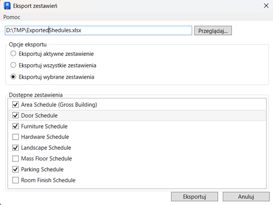 Masz już dość czasochłonnego eksportowania zestawień z Revita do plików TXT lub CSV, a następnie ręcznego przenoszenia ich do Excela? Wypróbuj naszą nakładkę do Autodesk Revit, która w prosty sposób automatyzuje eksport danych bezpośrednio do formatu XLSX – szybciej, wygodniej i bez błędów!