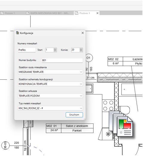 Interfejs nakładki MAT pokazujący okno dialogowe generatora kart mieszkań w programie Revit.